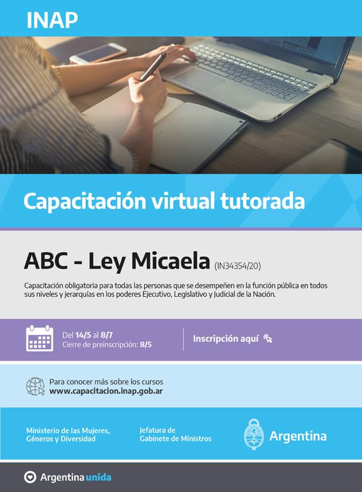 Desde el INAES acompañamos la iniciativa e invitamos a que se inscriban desde hoy hasta el 8 de mayo a través de https://capacitacion.inap.gob.ar/actividad/abc-ley-micaela/.