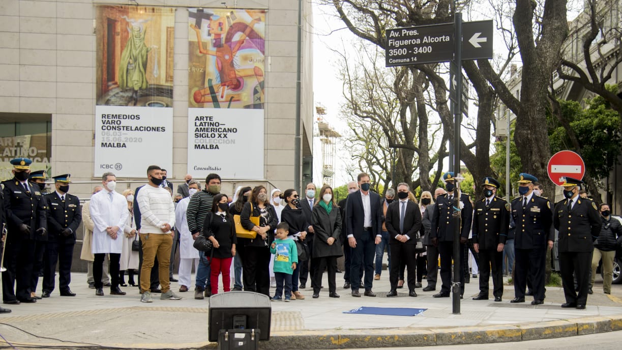El vicejefe de Gobierno a cargo del Ministerio de Justicia y Seguridad de la Ciudad de Buenos Aires, Diego Santilli, junto con la ministra de Seguridad de la Nación, Sabina Frederic, encabezaron hoy, tras cumplirse un mes del fallecimiento de Juan Pablo Roldán, un homenaje al policía. Durante el acto se descubrió una placa conmemorativa en la esquina de la Av. Figueroa Alcorta y San Martín de Tours, sitio en donde el efectivo de la Policía Federal Argentina fue atacado.