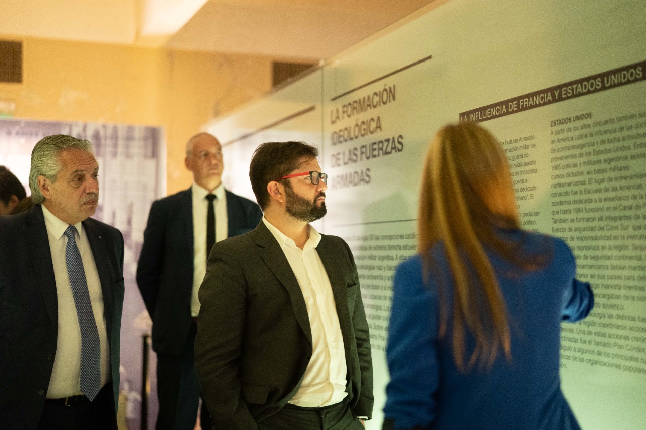 Boric estuvo acompañado durante el recorrido por el presidente Alberto Fernández; el canciller Santiago Cafiero; el ministro de Justicia y Derechos Humanos, Martín Soria; el embajador argentino en Chile, Rafael Bielsa; y el secretario de Derechos Humanos, Horacio Pietragalla Corti.
