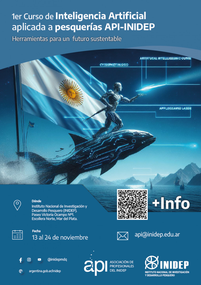 El Instituto Nacional de Investigación y Desarrollo Pesquero (INIDEP) y la Asociación de Profesionales del INIDEP (API) anuncian la apertura de inscripciones para el “1er Curso argentino de Inteligencia Artificial aplicada a pesquerías”. Este curso presencial se llevará a cabo en las instalaciones del INIDEP los días 13, 15, 17, 20, 22 y 24 de noviembre, de 9 a 13.