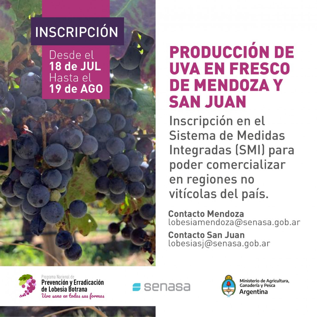 Aquellos productores de uva en fresco que deseen registrarse en el SMI, deben enviar un correo electrónico a: [email protected] en Mendoza o [email protected] en San Juan. Para más información, comunicarse al teléfono (264) 4266675 - San Juan o al (261) 4984131/4985011 – Mendoza.
