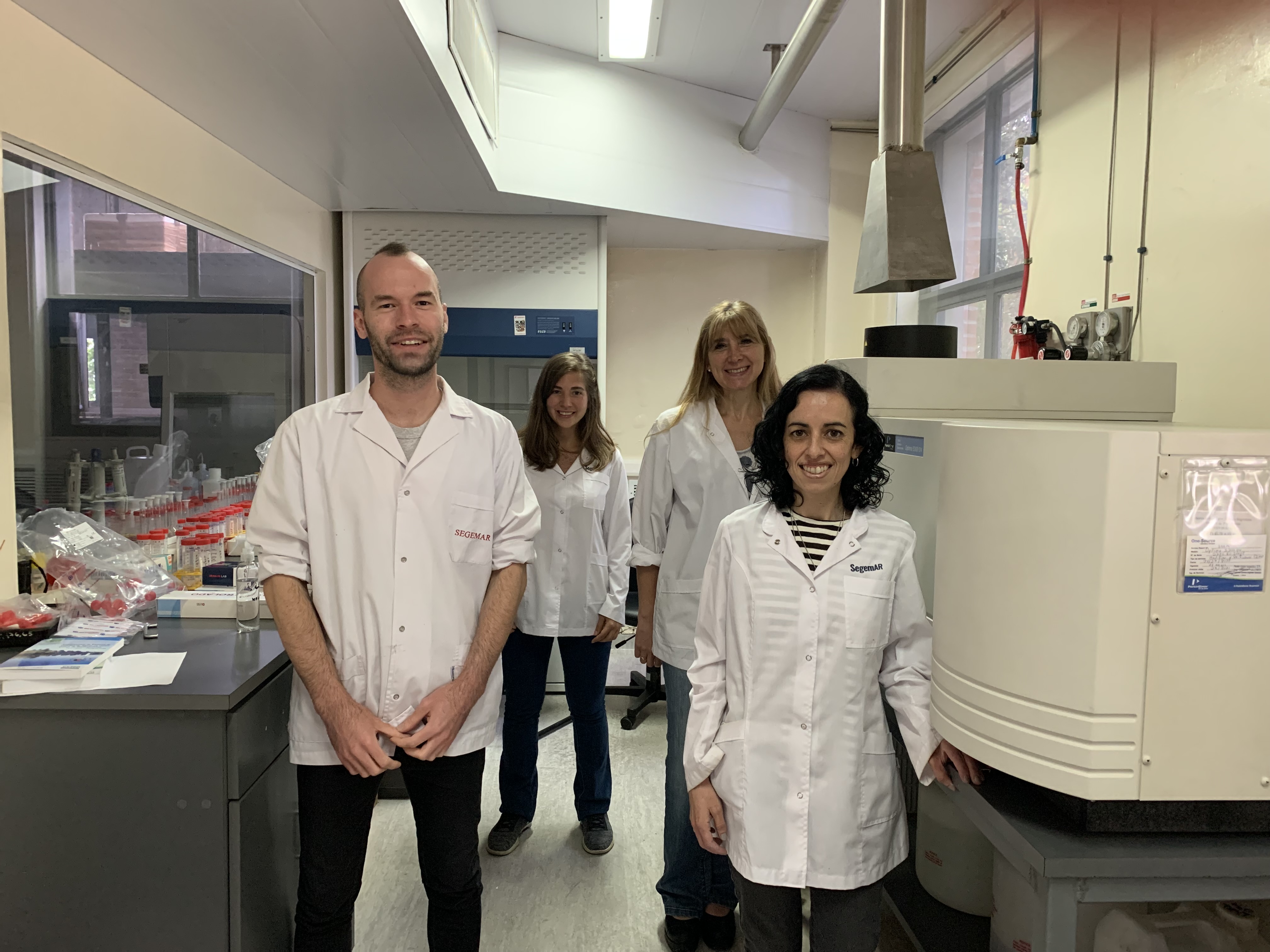 Miembros del equipo del laboratorio químico del SEGEMAR que participó de los ensayos interlaboratorio. De izquierda a derecha: Técnico Alejandro Díaz, Lic. Jimena Berce, Farm. Liliana González (responsable de la Dirección de Servicios Analíticos) y Lic. Silvina Carrizo. Todos junto al equipo de Espectroscopia de Emisión Atómica con Plasma de Acoplamiento Inductivo ICP-OES, que se utilizó para las determinaciones.