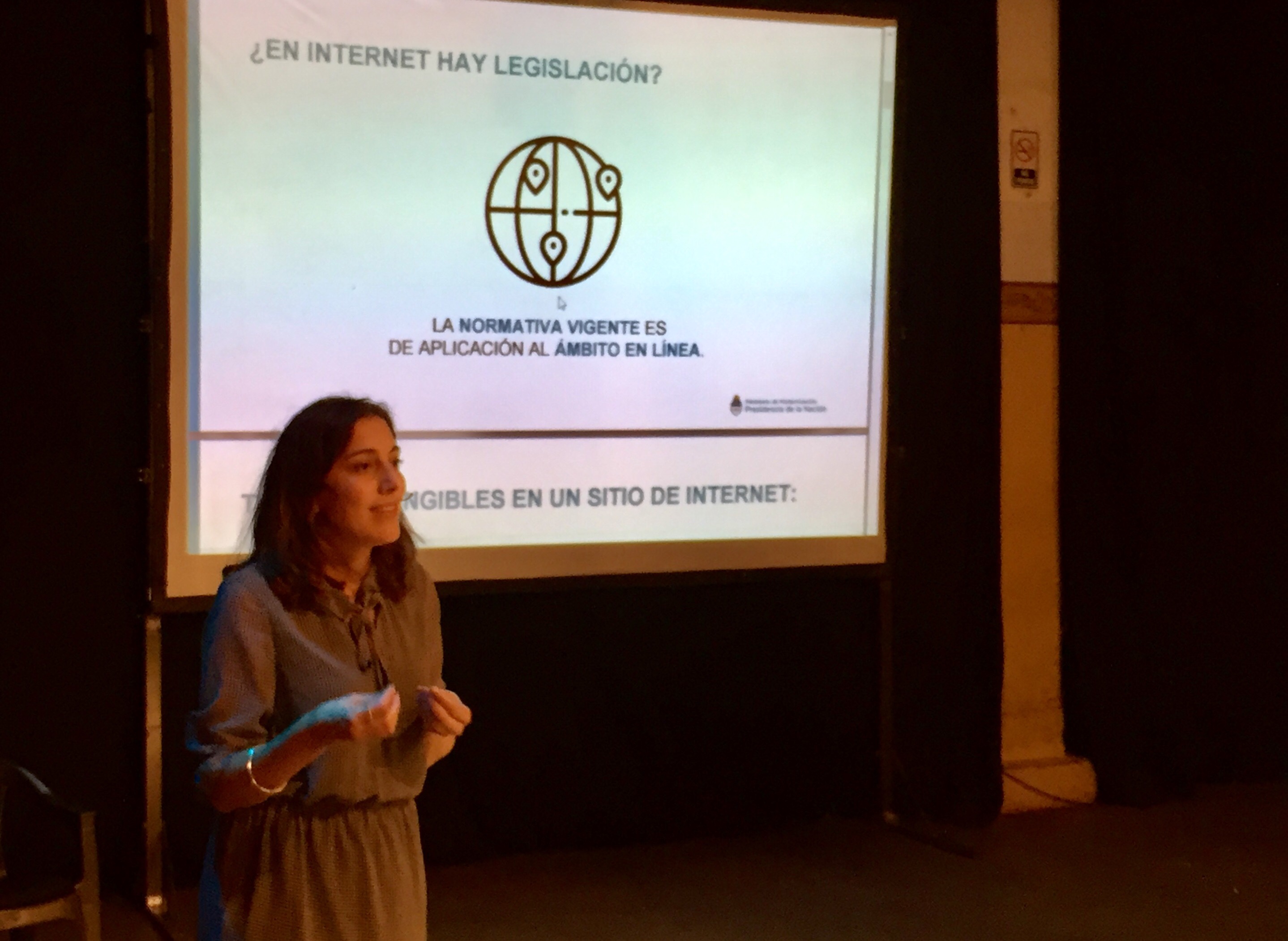 Instantes antes, Silvana Rivero, abogada y analista de políticas públicas de la Dirección Nacional de Políticas y Desarrollo de Internet, brindó una capacitación sobre “Aspectos legales que impactan en Internet” dirigida a ONGs. Dominios, marcas y derechos de autor en el entorno en línea fueron algunos de los temas explicados ante un auditorio de unos 50 representantes del sector.
