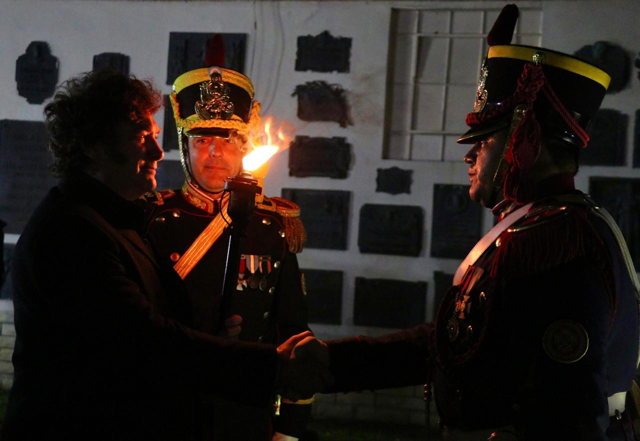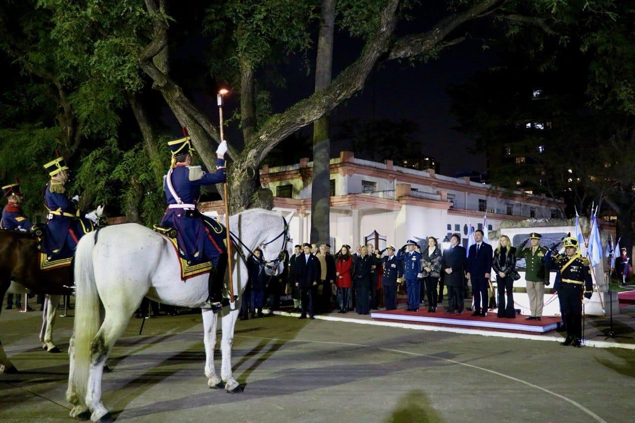 El ministro de Defensa, Luis Petri, acompañó al presidente Javier Milei en la recepción en el Regimiento de Granaderos a Caballo de la llama votiva, que se mantiene encendida en la fachada de la Catedral Metropolitana, en permanente recuerdo del Libertador.