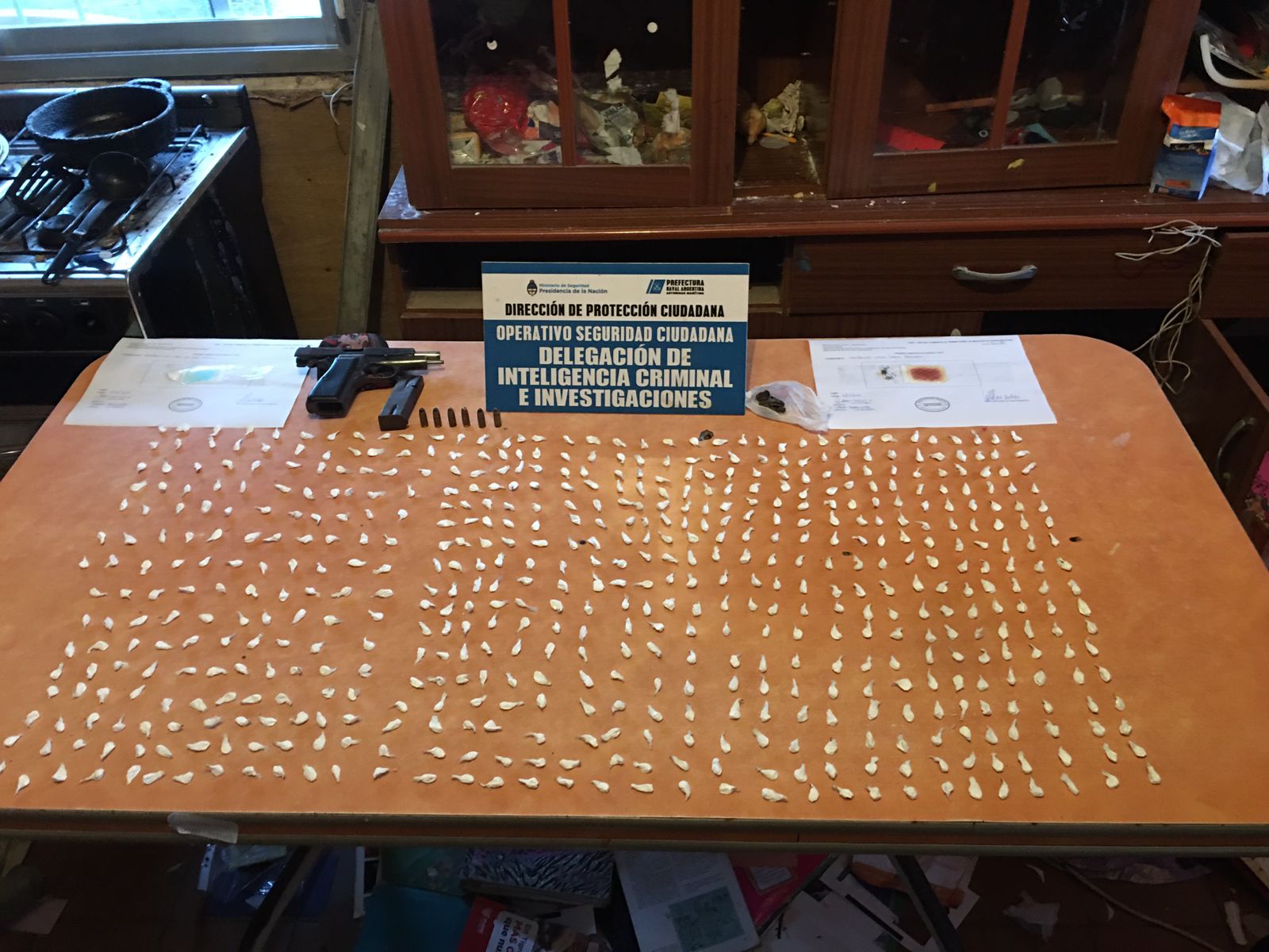 En el lugar, los efectivos aprehendieron a dos hombres y tres mujeres e incautaron 111 gramos de cocaína y 5 de marihuana. Además, secuestraron un auto, un celular, elementos de corte y fraccionamiento, una pistola 9mm con municiones y casi 80 mil pesos en efectivo.