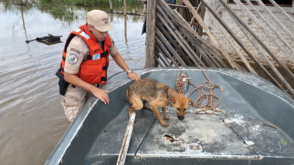 Los efectivos patrullaban el área urbana inundada, a bordo de una embarcación de la Institución, cuando fueron alertados por los aullidos de Daisy, una perrita de tres años que estaba sola, bajo el agua, cerca de una valla de madera.
