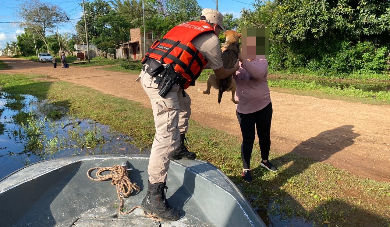 Personal de la Prefectura Naval Argentina rescató a una perrita que estaba atrapada en el patio de una vivienda de una zona inundada en la localidad correntina de Alvear, debido a la creciente extraordinaria del río Uruguay.