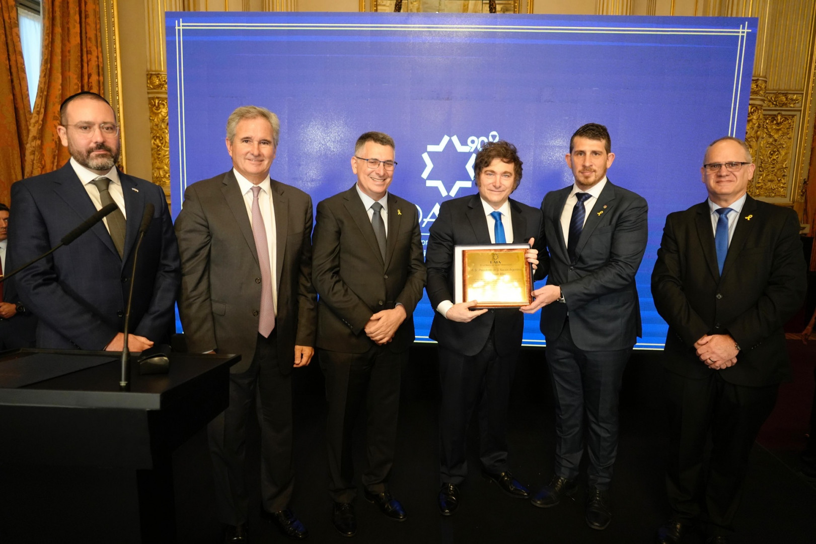 La celebración se realizó en presencia del Canciller israelí, Gideon Sa’ar, y Milei fue distinguido por su compromiso en la lucha contra el antisemitismo y por el reconocimiento al Estado de Israel por parte del Presidente de la DAIA, Mauro Berenstein; el embajador de Israel en Argentina, Eyal Sela; y el Ministro de Relaciones Exteriores, Comercio Internacional y Culto, Pablo Quirno.