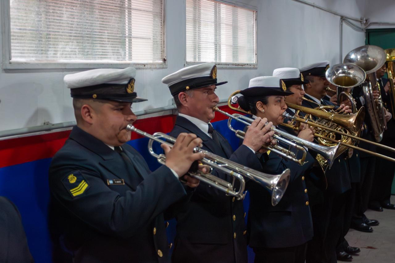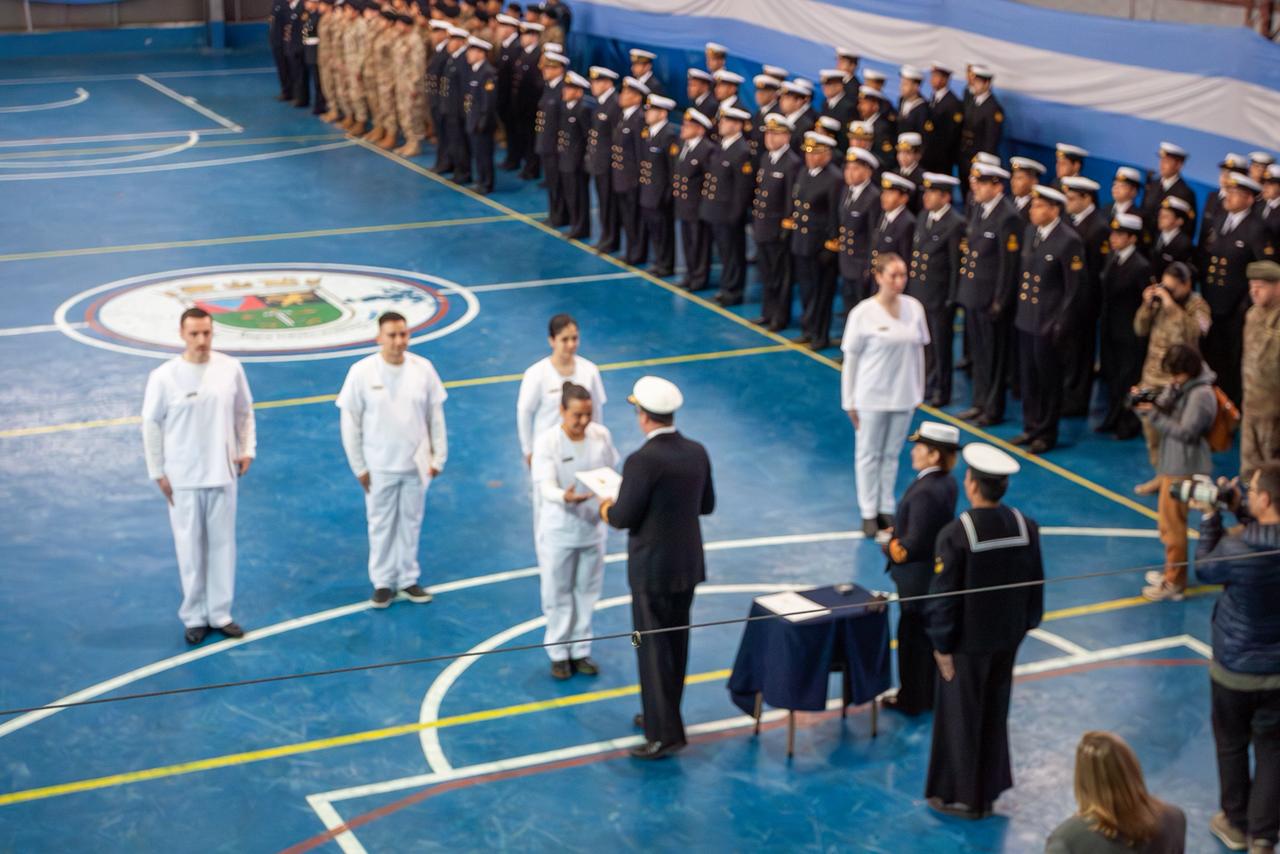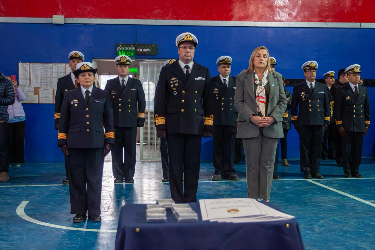 La ceremonia concluyó con la entrega de distintivos, la ejecución de la Diana de Gloria por parte de la Banda de Música del Área Naval Austral, y el cierre con la Marcha de las Malvinas y la Marcha de la Armada, en un clima de emoción y orgullo institucional.