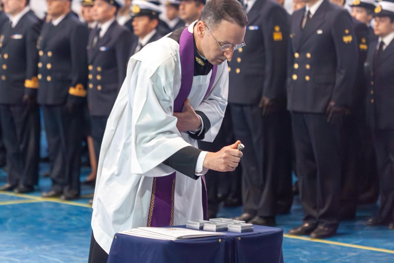 Seguidamente, se dio lectura a la Orden de Egreso del Curso de Asimilación Regional Naval, y el Capellán del Área Naval Austral, Padre Guido Casilo, realizó una invocación religiosa y bendijo los diplomas y jinetas, marcando el inicio de una nueva etapa en la carrera de los flamantes oficiales.