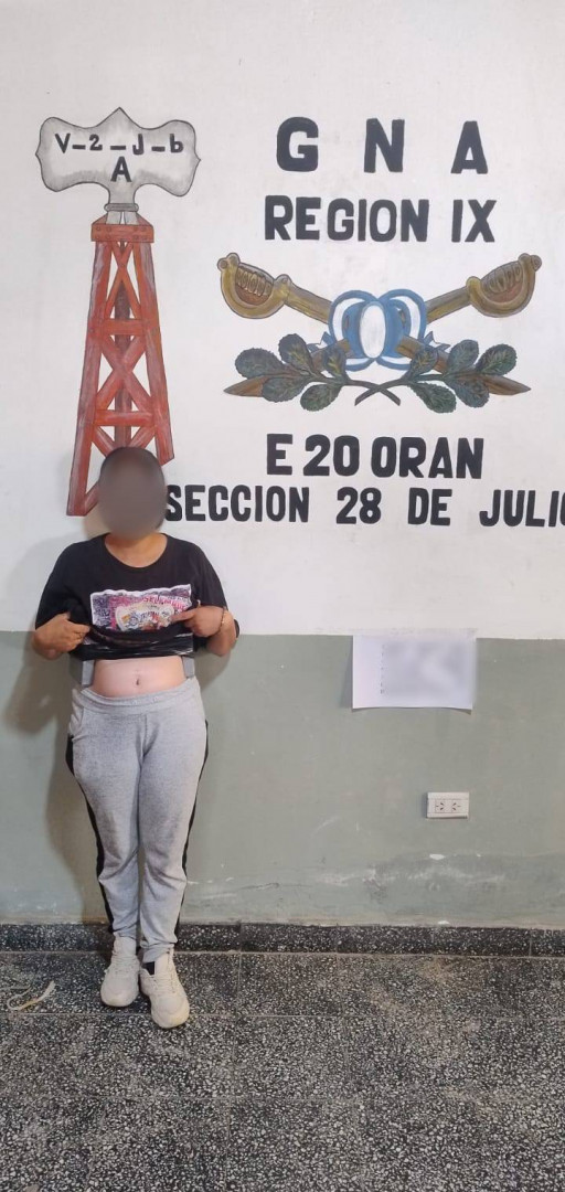 Consecuentemente, los uniformados constataron la presencia de tres paquetes rectangulares adosados al abdomen de la mujer y otros dos de similares características ajustados con cinta a los lados del tronco de la ciudadana acompañante.