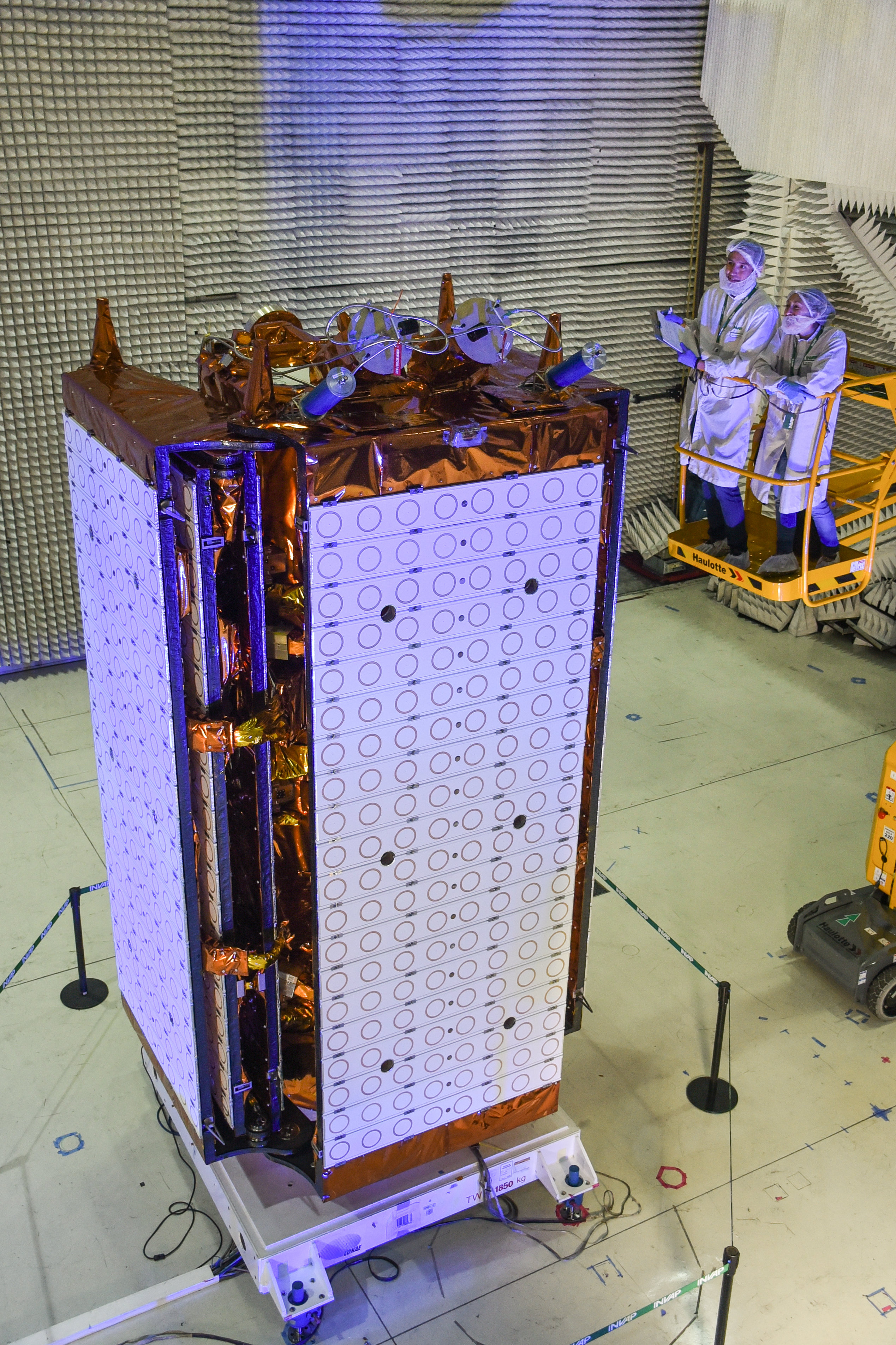 SAOCOM 1B plegado, en facilidades de INVAP/CETSA en Bariloche, listo para viajar al espacio.