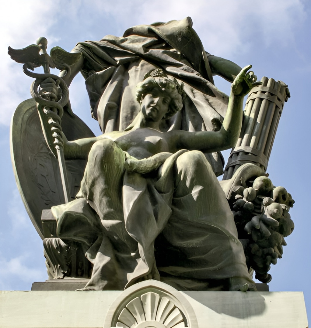 Sus grupos de bronce y mármol son de clara factura académica, destacándose en el centro la figura del presidente conduciendo al país a un inexorable destino de grandeza, simbolizado éste por un barco con un león como mascarón de proa, emblema de poder, sabiduría y protección; en lo alto se yergue la República y a su espalda una contrafigura –ambas armadas con escudo, cetro y haz de flechas– y en los flancos, custodiando su legado, la Justicia y Palas Atenea, diosa de la sabiduría, armada en defensa del Progreso.