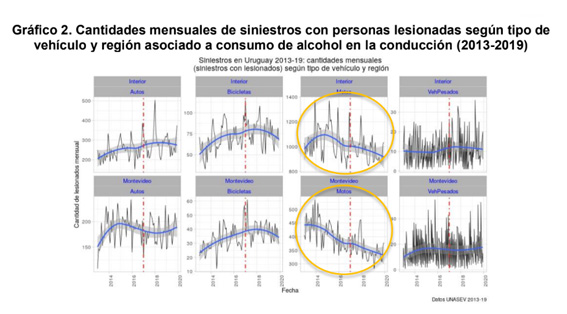 Luego de implementada la Ley, los datos de fuentes uruguayas indican que entre 2016 y 2017 los siniestros fatales se redujeron en un 20,9% en 12 meses y en un 14,1% en 24 meses. En el Gráfico 2 se analizan las tendencias de siniestralidad vial asociadas al consumo de alcohol. La ley de Alcohol Cero ha tenido impacto en los hechos viales vinculados a este comportamiento, muy marcado entre los motociclistas, y más suave e inestable entre automovilistas(7).