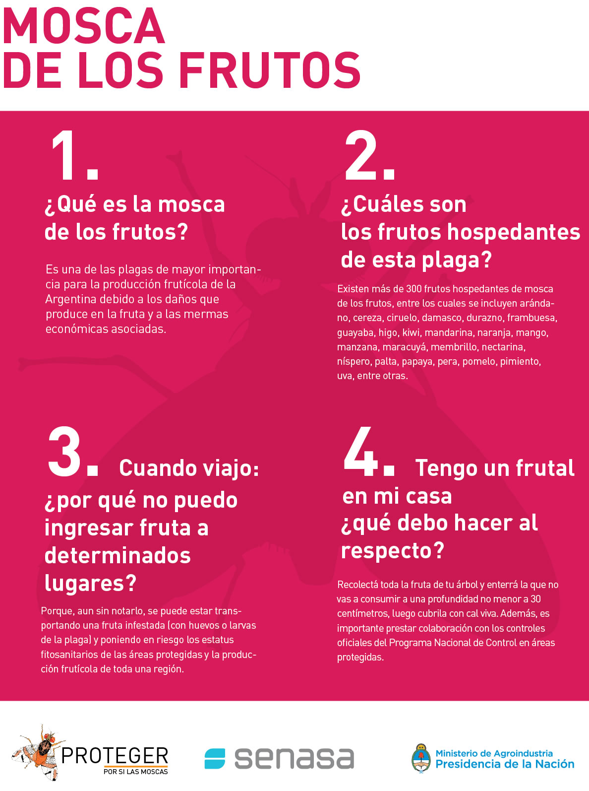 La mosca de los frutos es considerada una de las plagas de mayor importancia económica para la producción frutihortícola de la Argentina, debido a los daños que produce en la fruta y al impacto económico y social asociado. Muchos productores, viajeros y personas con frutales en sus casas conocen poco o nada sobre la plaga, las consecuencias de su dispersión y las medidas necesarias para prevenirla.