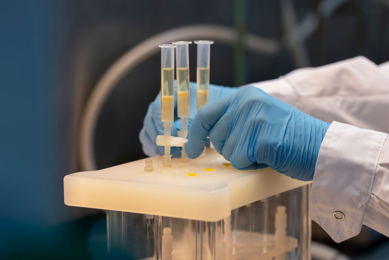 El equipamiento principal de este conjunto de determinaciones es el FT-IR, el cual permite identificar el polímero principal del producto en estudio. A partir de la interacción que presentan las moléculas presentes en dicho producto con la luz en el rango infrarrojo, se obtiene su espectro de referencia lo que permite identificar el componente polimérico principal del mismo. Este equipamiento es adecuado para identificar los extraíbles y componentes minoritarios de una formulación.