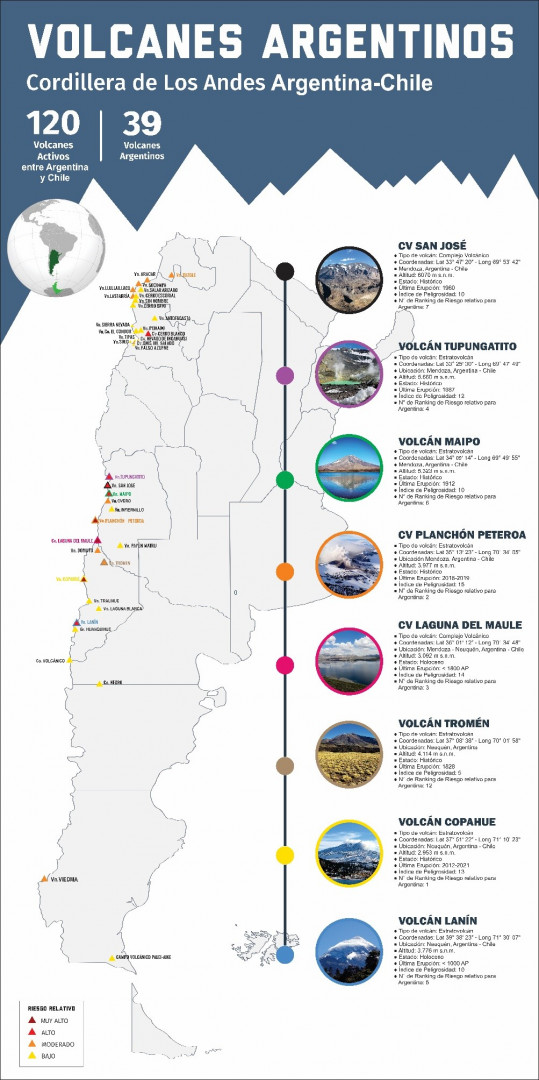 En Argentina y su límite internacional con Chile, existen al menos 39 volcanes considerados activos en el territorio continental, de acuerdo con el ranking de riesgo volcánico relativo elaborado por el SEGEMAR.