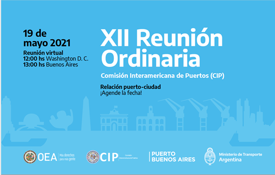El 19 de mayo de 2021 se celebró de manera virtual, debido a la pandemia por COVID 19, la XII Reunión Ordinaria de la CIP. Durante el evento, se aprobó la Resolución de Buenos Aires y el Plan de Acción de Buenos Aires 2021 – 2023, se llevaron a cabo las elecciones de nuevas autoridades del Consejo Ejecutivo de la Comisión Interamericana de Puertos (CECIP) 2021 – 2023 y se presentaron los informes de actividades de cada Comité Técnico Consultivo (CTC).