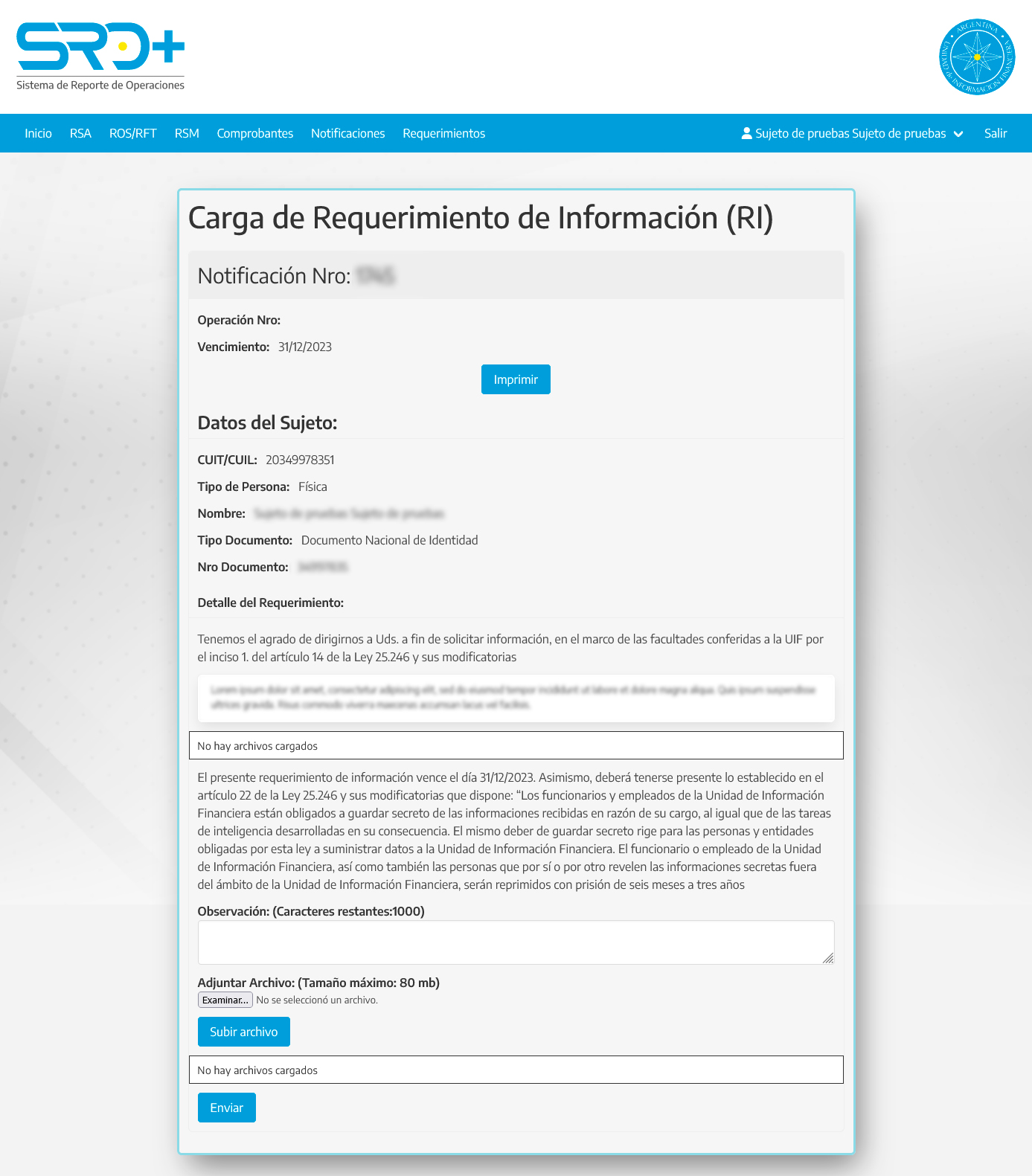 Una vez subido el archivo, presione enviar y la información será recibida directamente por la UIF.